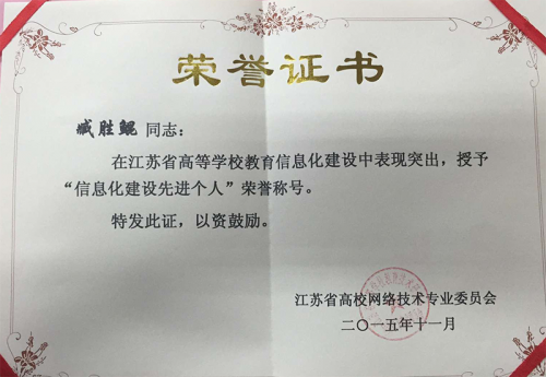 在日前结束的江苏省高校网络技术委员会第十一届年会、中国高等教育学会信息化分会第六届理事会第二次全体理事会议上,我校荣获江苏省高等学校信息化建设“先进集体”荣誉称号。