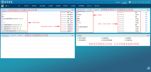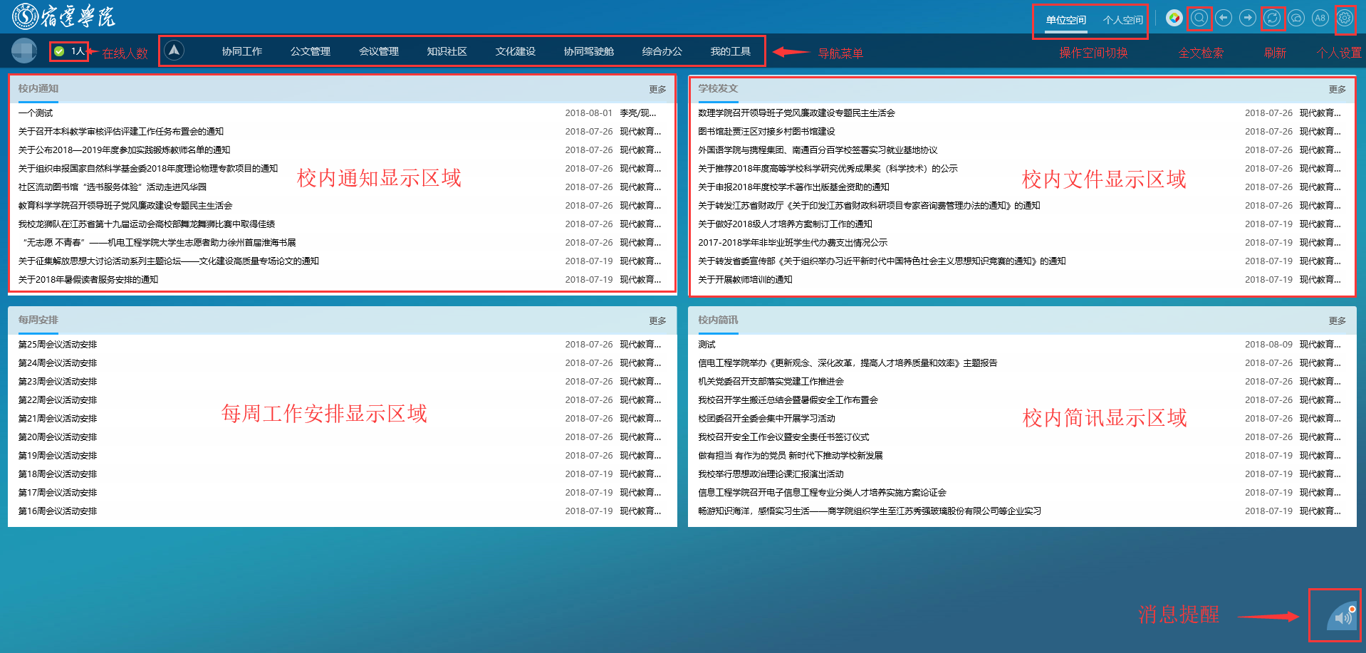 登录后,默认进入“单位空间”界面(根据各用户权限不同,主界面各板块显示内容不完全相同)。单位空间界面主要作用是集中显示了当前用户权限能够显示的校内通知、校内文件、每周工作安排、校内简讯等信息。