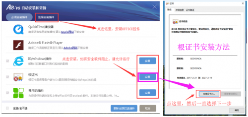 必须安装“IE/Windows插件”、“根证书”、“常用插件”、“Office控件”(在选择安装插件中)等插件,安装过程中建议关闭360等安全防护工具,或者选择允许运行。