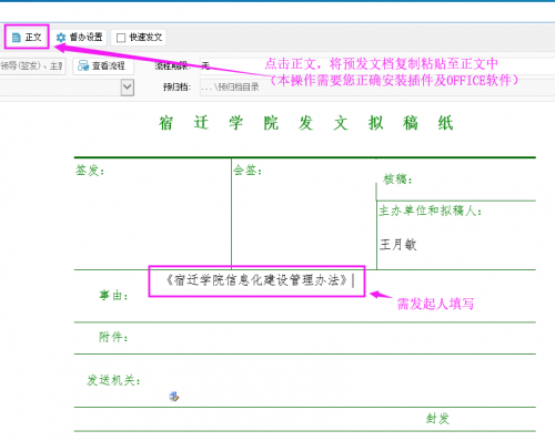 发起方法:依次点击菜单“公文管理”-“发文管理”,选择“拟文”,调用“宿迁学院发文拟稿纸”模板,如下图: