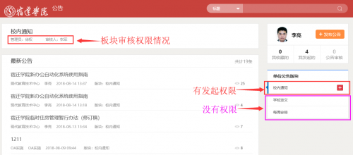 校内通知、校内简讯目前已授权科级以上人员有权发起,以“校内通知”为例,可以通过点击校内通知后面的“更多”或者菜单:文化建设-公告,进入板块页面,若您有相应的发布权限,会显示如下图:
