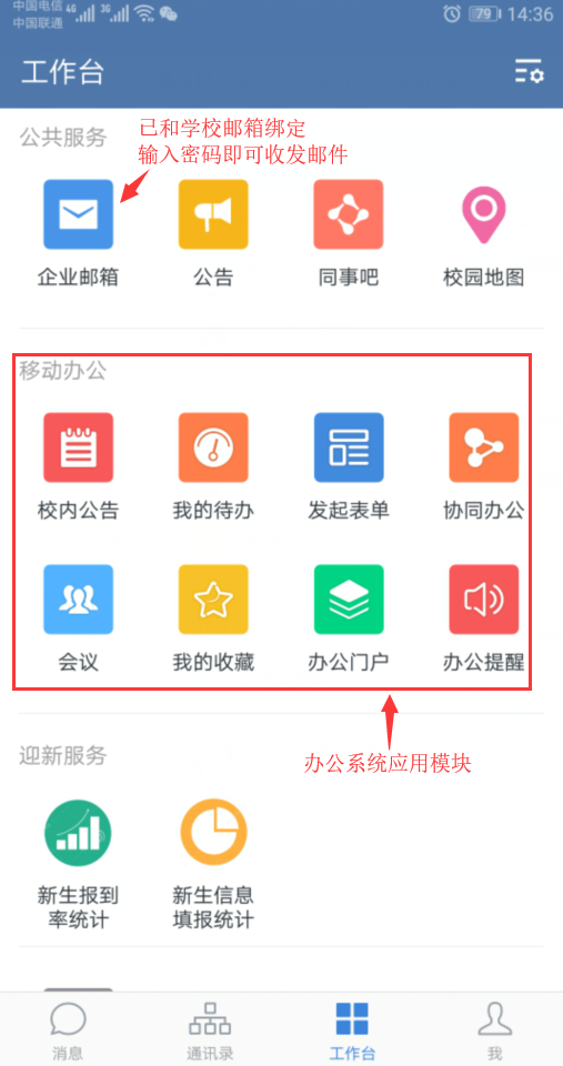 “企业邮箱”模块已和学校邮件系统做好后台绑定,用户只需要输入一次邮箱密码,即可实现邮件的随身收发。