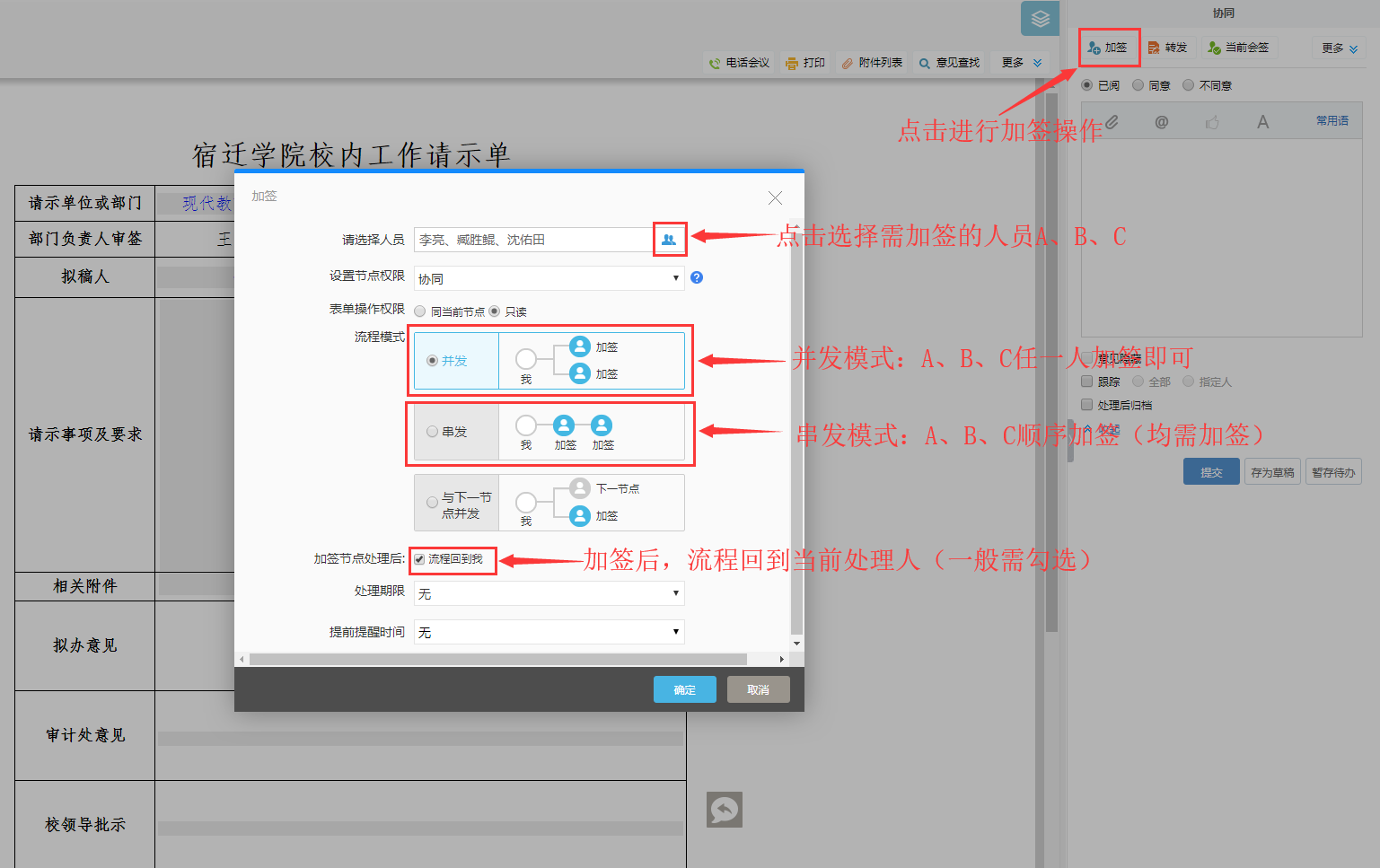 适用情况:当流程处理节点人员,需要在流程处理时,征询其他相关人员意见并体现在流程中时,需使用该功能。