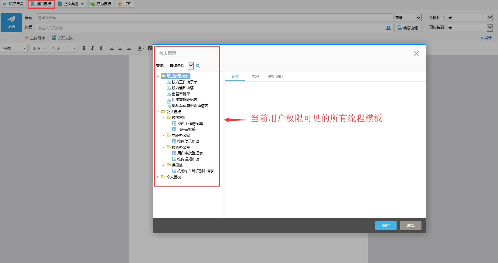 方式一:用户可通过菜单 协同工作 – 新建事项 发起一个自由流程,并通过点击 调用模板,调用相应流程模板发起流程,如下图: