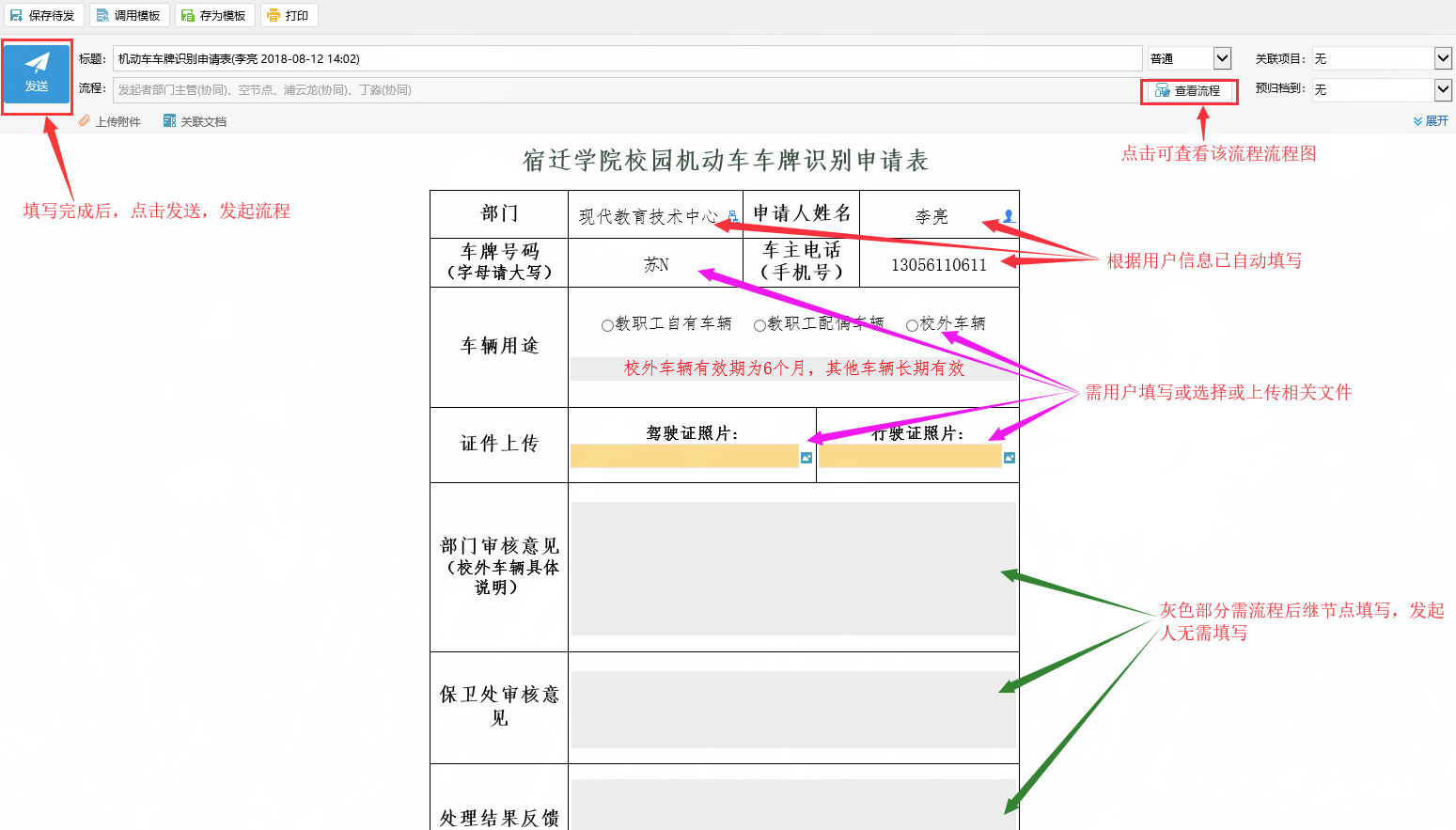 以“机动车车牌识别申请”流程为例,用户可点击或调用流程模板,发起该流程,如下所示: