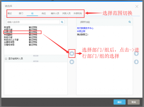 部门级人员选择,选定部门后,点击 -> 按钮,进行部门级选择。