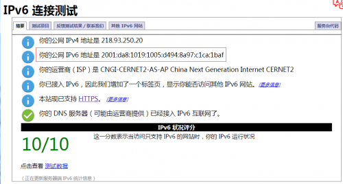 测试:用户可通过访问test-ipv6.com来测试IPv6网络的状态,如图所示。