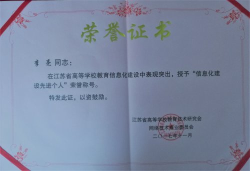 大会对2017年度高校信息化工作先进单位和个人进行了表彰,我校与东南大学等20所高校被评为“江苏省高等学校信息化建设‘先进集体’”荣誉称号。我校网络中心李亮老师获得“信息化建设先进个人”荣誉称号。